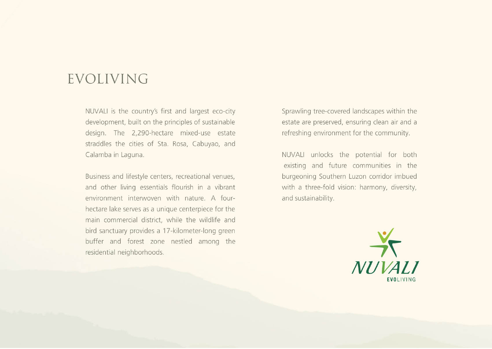 With a myriad of residential, commercial and recreational developments within a natural setting, NUVALI continues to pioneer the Evoliving lifestyle, where people and nature thrive.