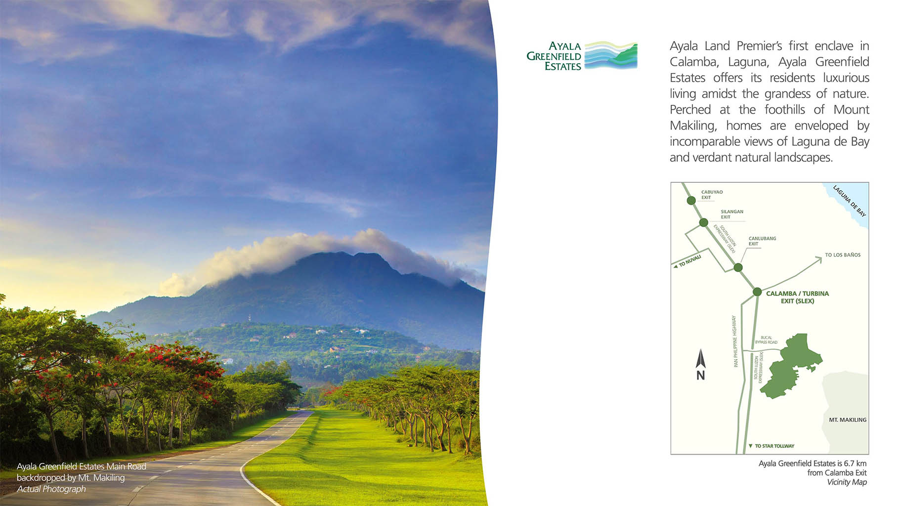 Ayala Greenfield Estates is a quick 20-minute drive away from Alabang, or 40 minutes from Makati. Its unique elevation – reaching 315 meters above sea level – accounts for a cool year-round climate and exceptional views of Mount Makiling, Laguna de Bay, Tagaytay Ridge, the golf fairways and adjacent woodlands.